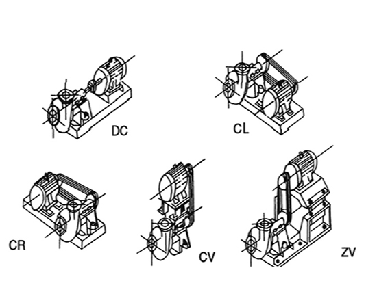 渣漿泵有多種安裝方式,泵的吐出口可沿鉛垂面旋轉安裝。傳動方式有彈性聯(lián)軸器方式傳動(DC傳動),